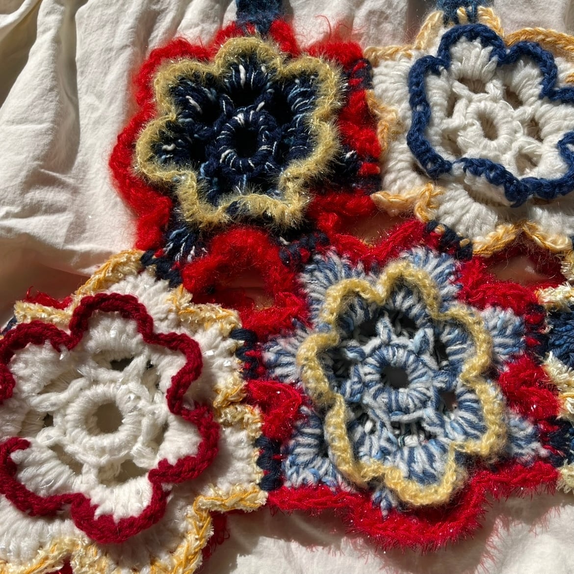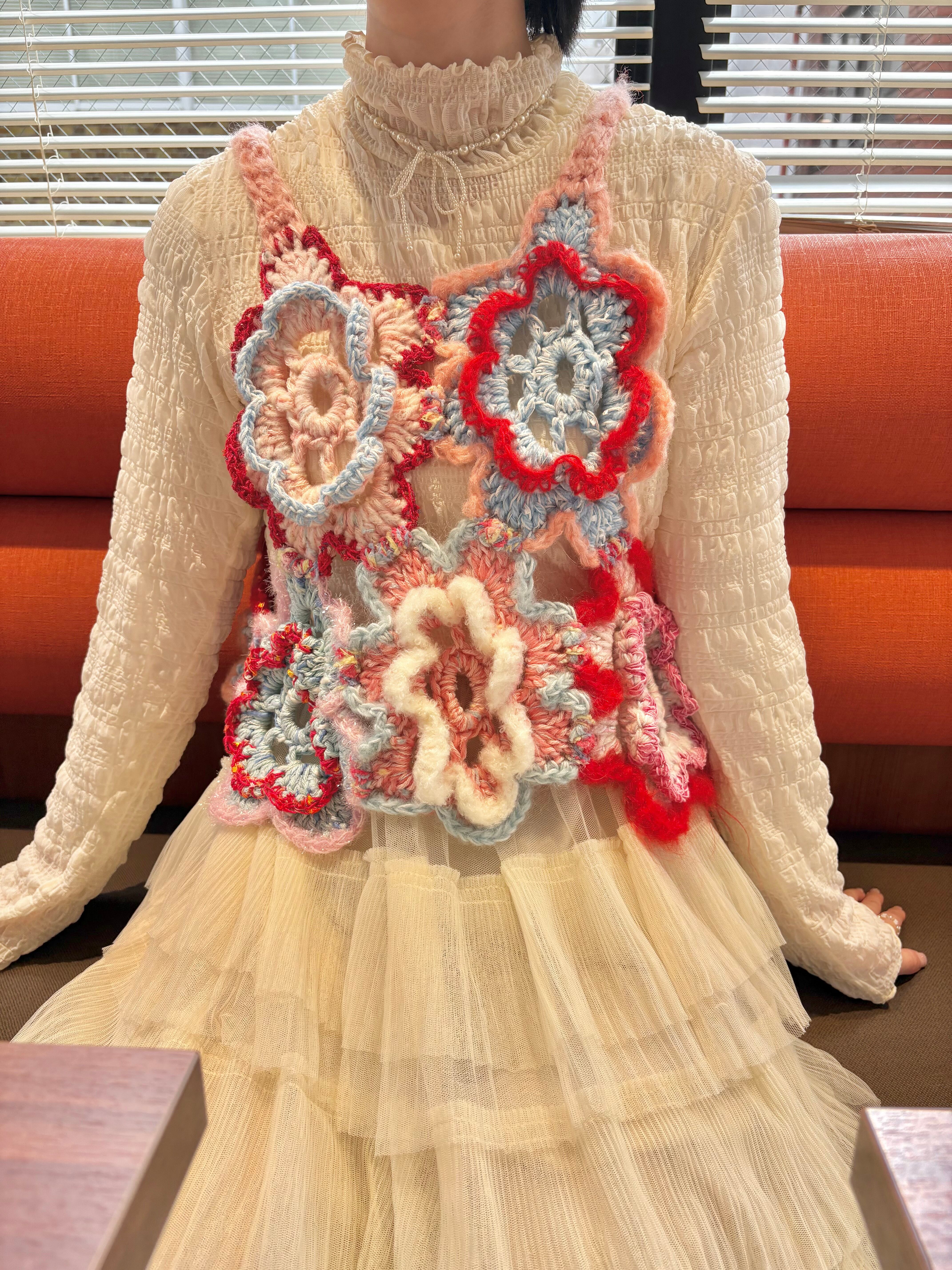 お花ひとつひとつ使用した毛糸が違うので気分によって前後お好きな方を前にして着用出来ます◎